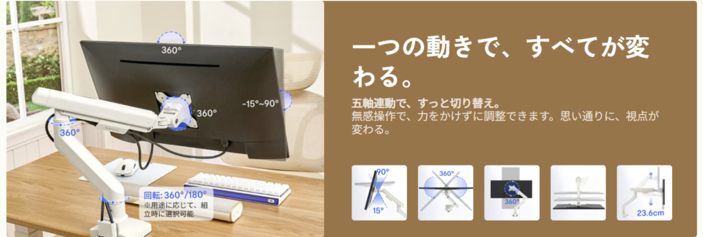 せっかくならモニターアームも揃えて、統一感を狙っちゃうのもアリでしょう。